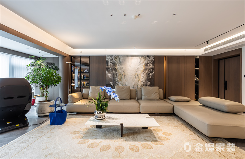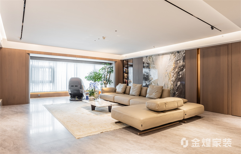 该设计以无主灯设计、岩板与木作结合,打造通透大气的现代轻奢大平层,兼具质感与生活温度。